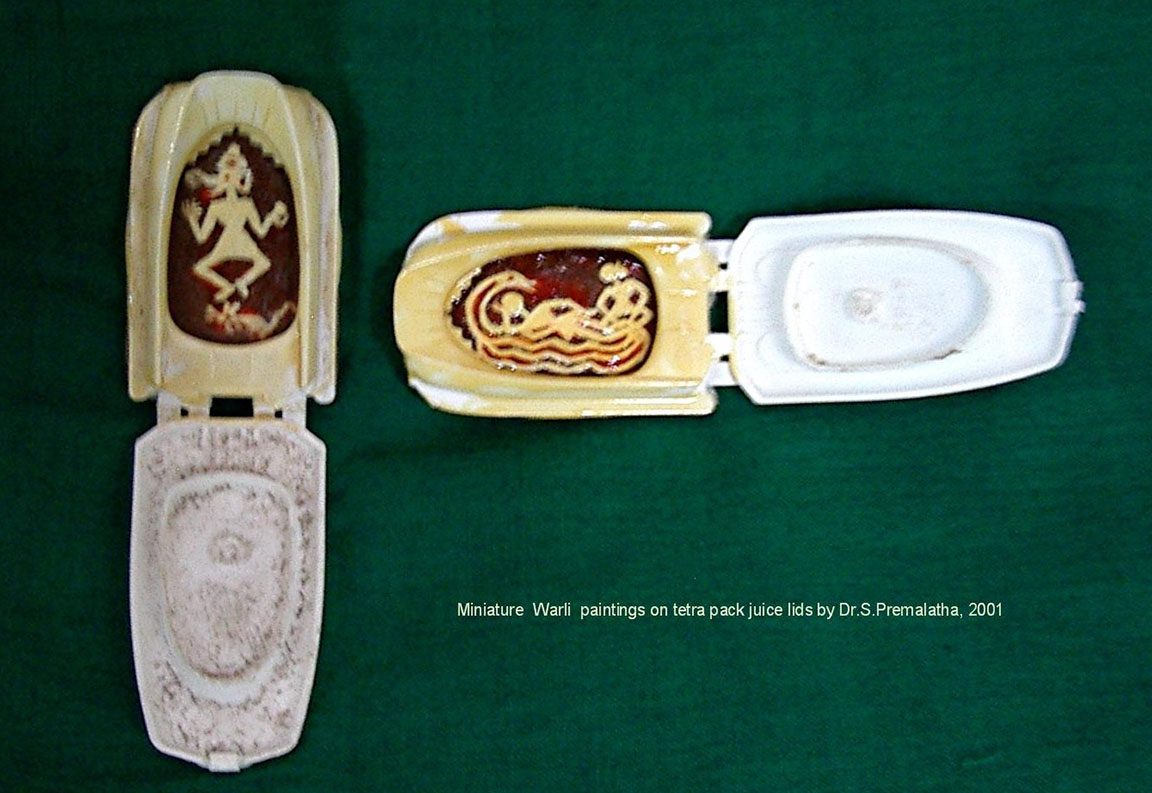 Miniature Warli Paintings on tetra pack juice lids- by Dr. SP