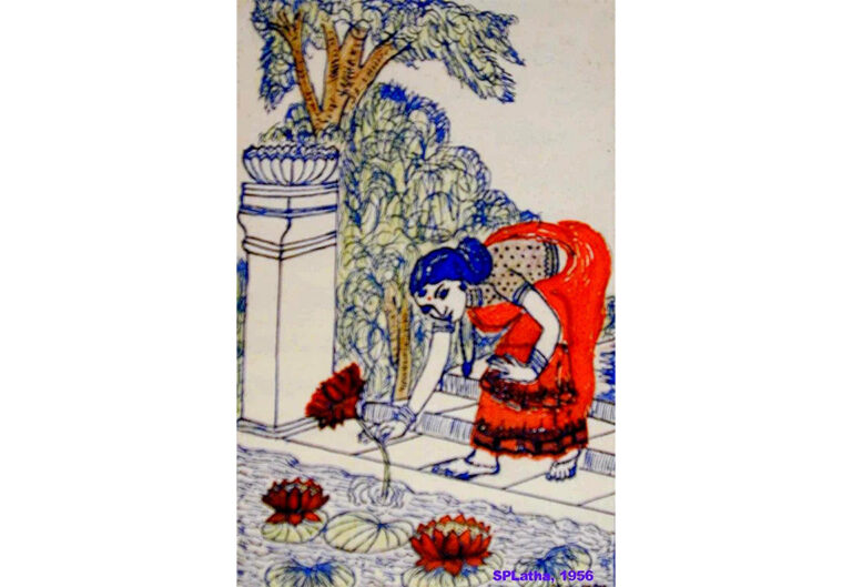 Ink drawing of school days -A lady at a lotus pond ,1956