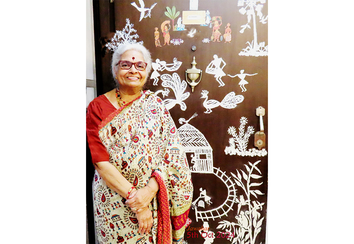 Dr. S. Premalatha besides her Warli painting on the entrance door.